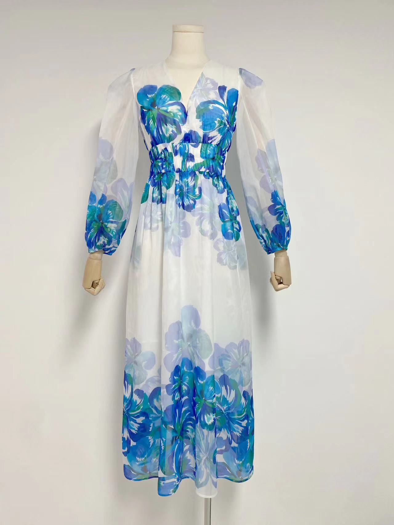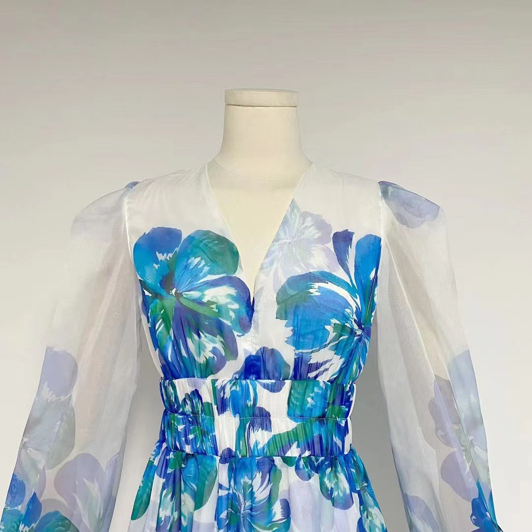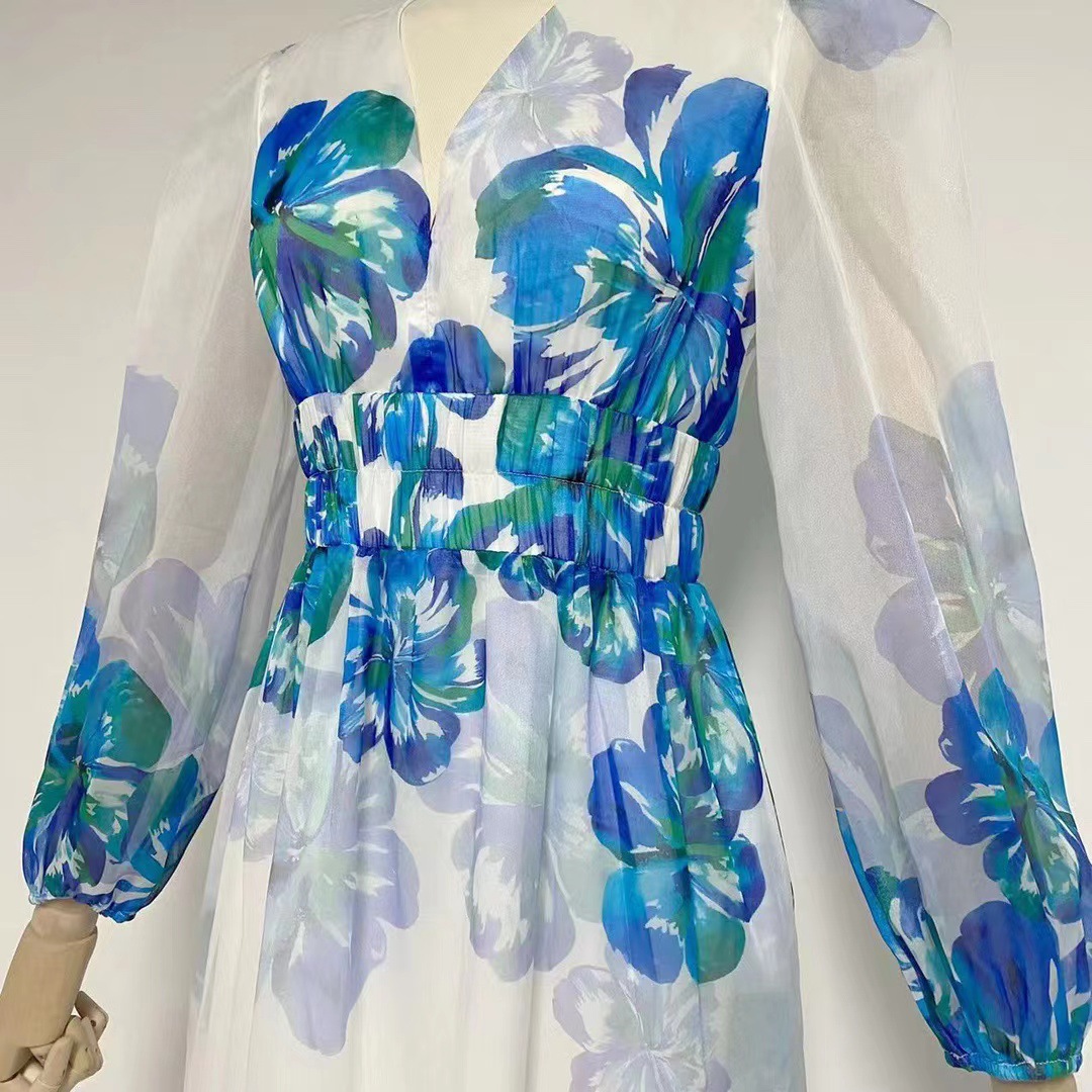 Women's Fashionable Printed V-Neck Long Dress With Puff Sleeves