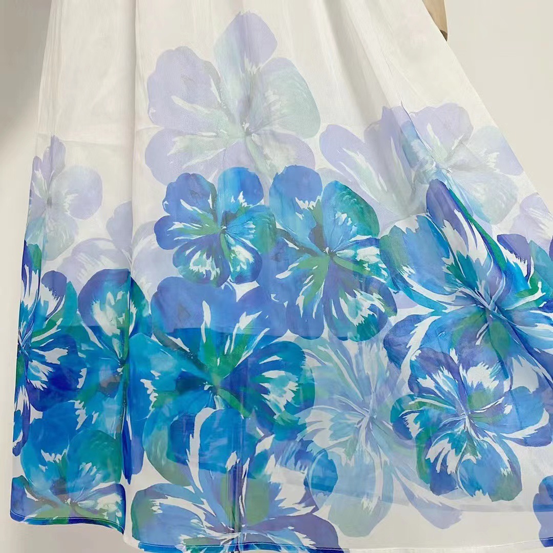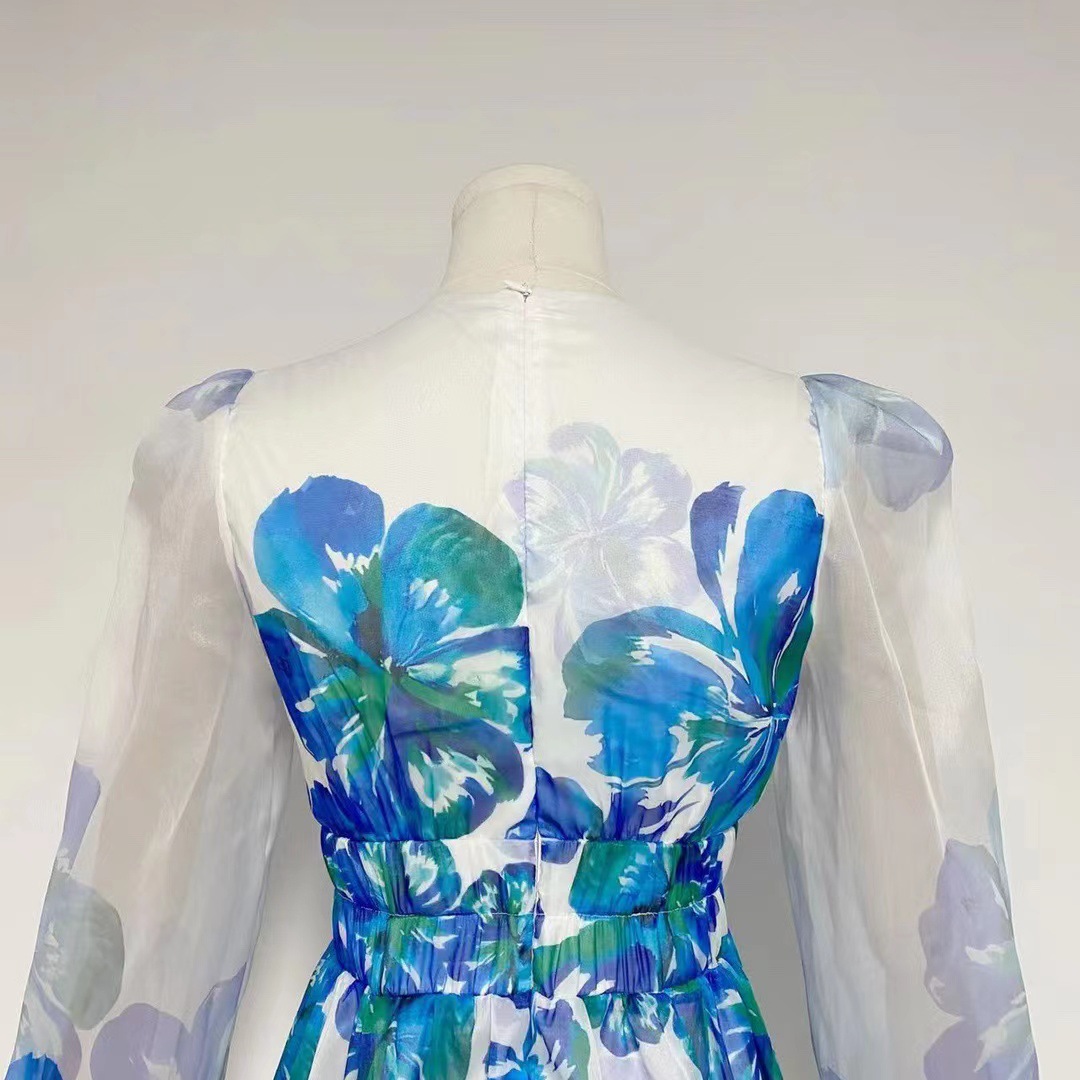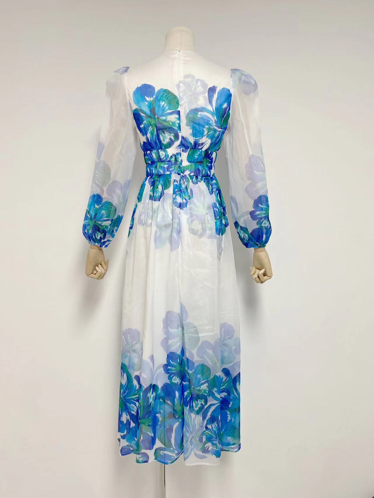 Women's Fashionable Printed V-Neck Long Dress With Puff Sleeves